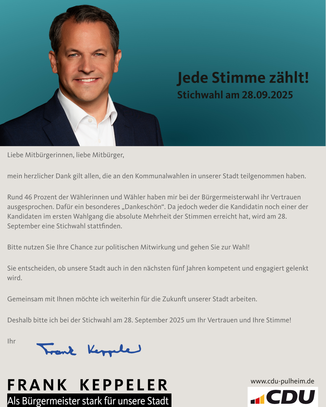 Hierzu der CDU-Stadtverbandsvorsitzende Rafael Kriege: „Wir haben mit Frank Keppeler einen überaus erfolgreichen Bürgermeister, der Pulheim - auch in schwierigen Zeiten - auf Kurs gehalten hat. Im interkommunalen Vergleich steht Pulheim heute sehr gut dar. Wir sind sicher, dass wir mit Frank Keppeler den richtigen Kandidaten für die anstehenden Herausforderungen, wie beispielsweise das umfangreiche Schulneubau- und sanierungsprojekt, die Realisierung der neuen Feuerwehrgerätehäuser, die Fertigstellung des Projekts Pulheimer See sowie die Umsetzung des Anspruchs auf einen OGS-Platz, haben.“